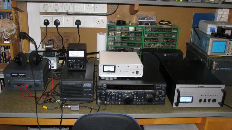 | Yaesu FT-1000MP MK5 with Inrad roofing filter DB6NT (Kuhne Electronic) TR144H+40 transverter with 14MHz IF Beko HLV-1500 linear amplifier Mirage MP-2 power meter Heil ProSet with HC-4 element Yaesu DVS-2 voice keyer Yaesu SP-8 speaker modified to allow headphones and speaker audio simultaneously |