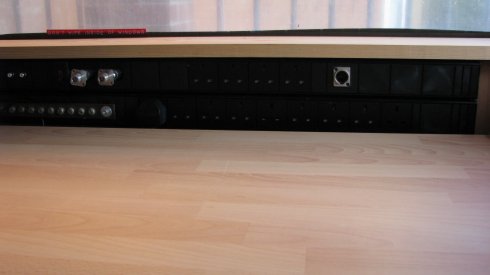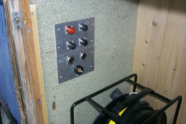 July 2009 Power distribution and RF feeds for the left and right hand operating positions that include five high current 12V DC outputs and a load of earthing points (directly below the RF feeds). The four mains sockets on the top row are connected directly to the 12V inverter for emergency mains operation. The XLR sockets are for connecting rotators.