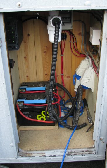 June 2007 The other side cupboard containing all the utilities - mains inputs, circuit breakers, 12V leisure batteries for lighting, inverter to provide back-up 230V mains from the batteries....oh and the drain for the sink.