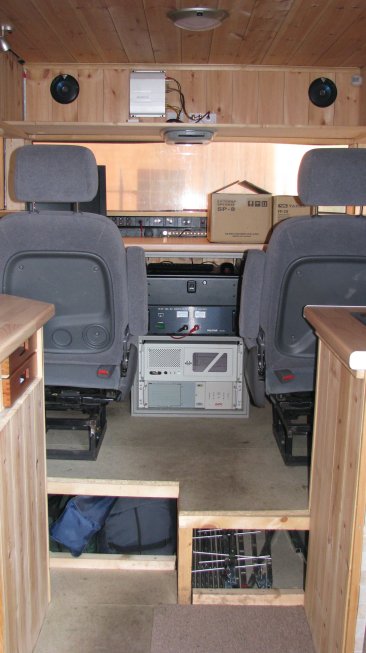 July 2009 Three views showing the inside of T'Van - kitchen area on the left, operating area with 12V DC power supply, PC for contest logging software and UPS in the centre, sink and toilet on the right. Only one big problem - the chairs are way too comfortable to be able to operate 24 hours without falling asleep!